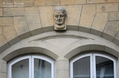 Віконні портали арочної форми другого поверху увінчані маскаронами (два жіночих, 3 – чоловічих, що можливо зображають представників різних національностей, що населяли Львів). Підвіконний карниз прикрашений декоративною металевою візерунчастою решіткою, яку підтримують скульптури горгулій (чи якихось інших потвор). / Window portals of arched shape at the first floor are crowned with mascarons (2 women and 3 men, they may represent different nationalities that had been living in Lviv those days).