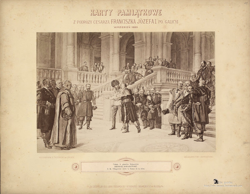 У вересні 1880 року ясновельможний цісар відвідав Галичину, його було зустріто з великими почестями, урочистостями та помпезністю. Згодом вийшов альбом акварелі видавництва Закладу художньо-фотографічного Е. Тремеського, який було видано у двох форматах - Великого розміру за ціною 80 зл.!!!, і кабінетного (який ми сьогодні і погортаємо) вартістю 12 злотих. / In September 1880 Austrian-Hungarian Emperor Franz Josef I visited Galicia and Lviv. Watercolour paint album edited by Tremesky's artistic and photographic agency was published in two formats, wich costed 80 and 12 Zloty for large and small edition correspondingly.